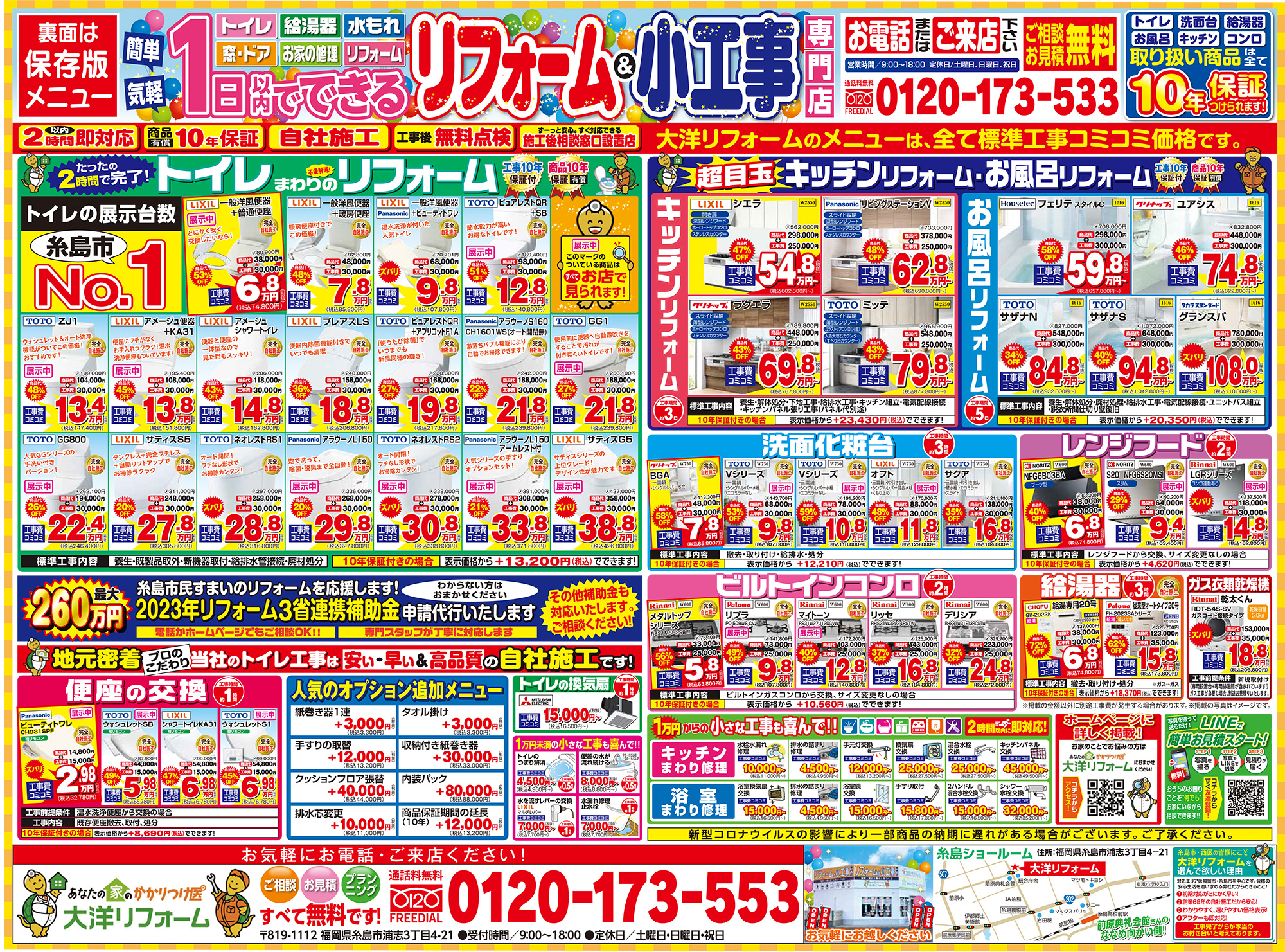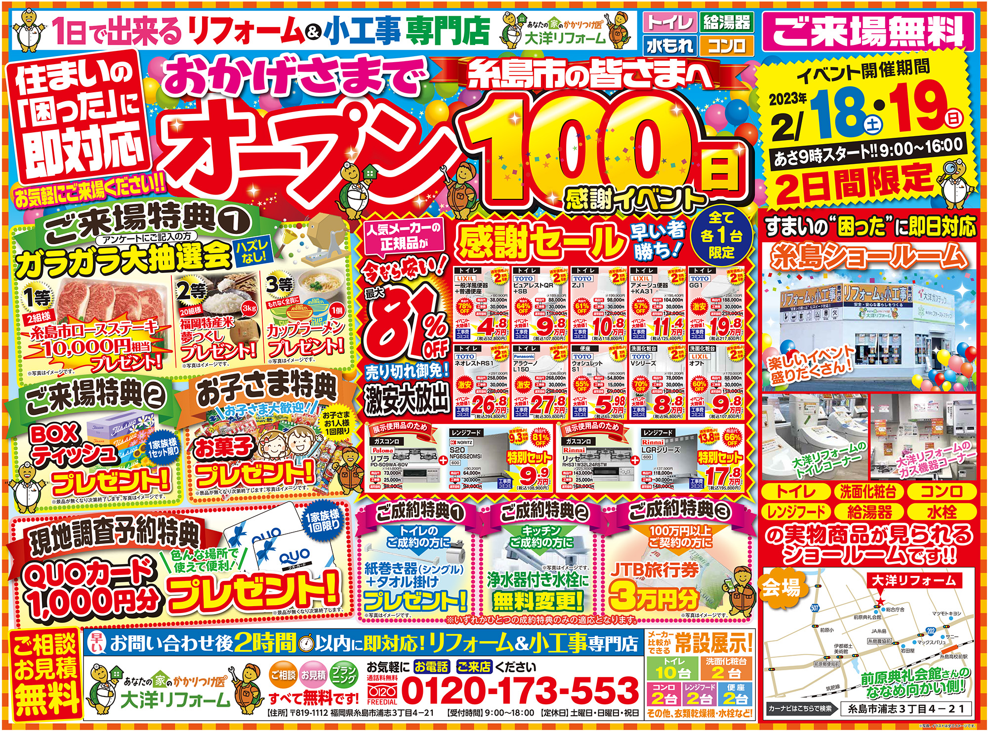 event 【早い者勝ち】感謝セール開催!!オープン100日感謝イベント 開催日時 2月18日(土)・19日(日)9:00~16:00 (会場:糸島ショールーム) 詳しくはこちら > 会場 糸島ショールーム 会場住所 福岡県糸島市浦志3丁目4-21 開催日時 2月18日(土)・19日(日)9:00~16:00 一言 住まいの「困った」に即対応 お気軽にご来場ください!! 備考 豪華ご来場特典をご用意!!ご相談・お見積りも無料となっております。 アクセスマップを確認する >> 一覧へ戻る