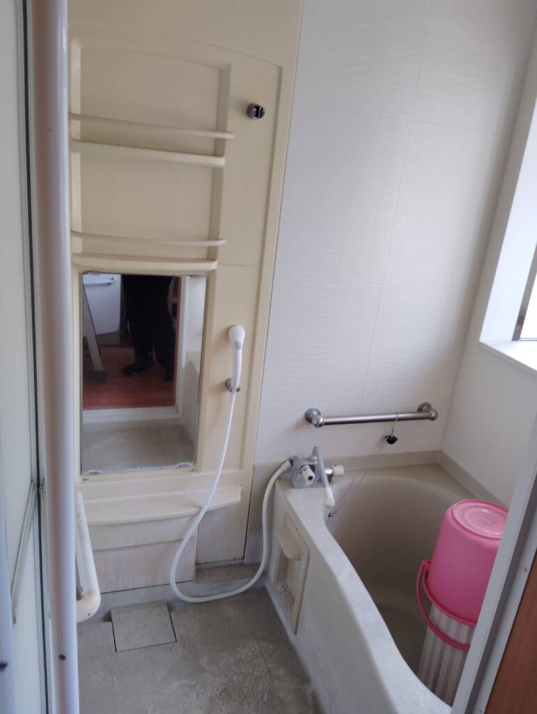 浴室リフォーム施工前のお写真です。 何年も使用していなく新しくしたいとの事でした。 明るめの壁をご希望され、寒さ対策の為に浴室暖房換気扇を希望されました。