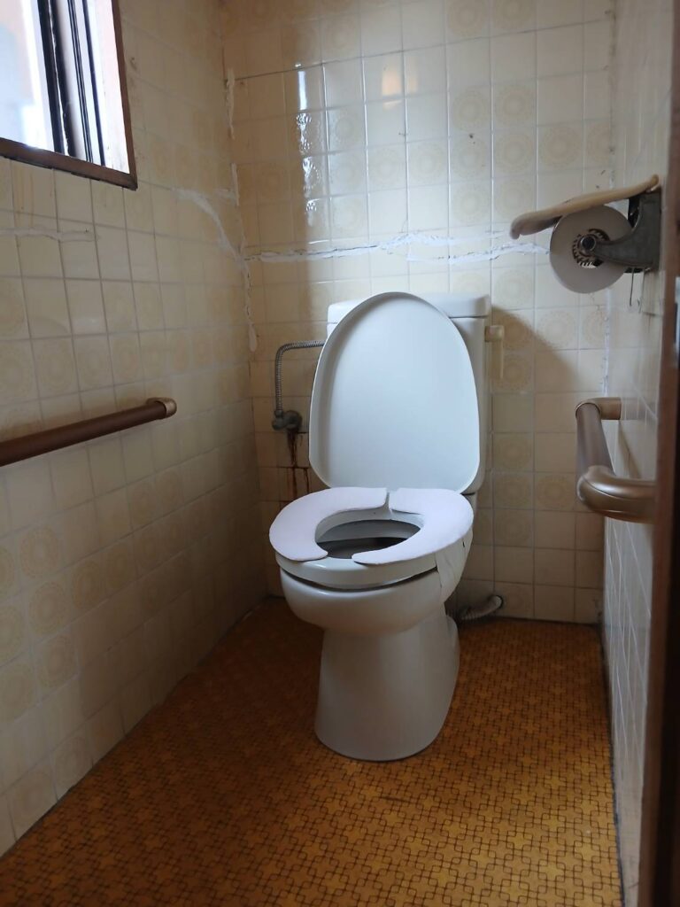 トイレリフォーム前のお写真です。 元々タイルでヒビも入ってきたので補修したいとの事でした。 トイレを明るくするために補修も兼ねまず板をはりその上からクロスを張るようご提案させて頂きました。