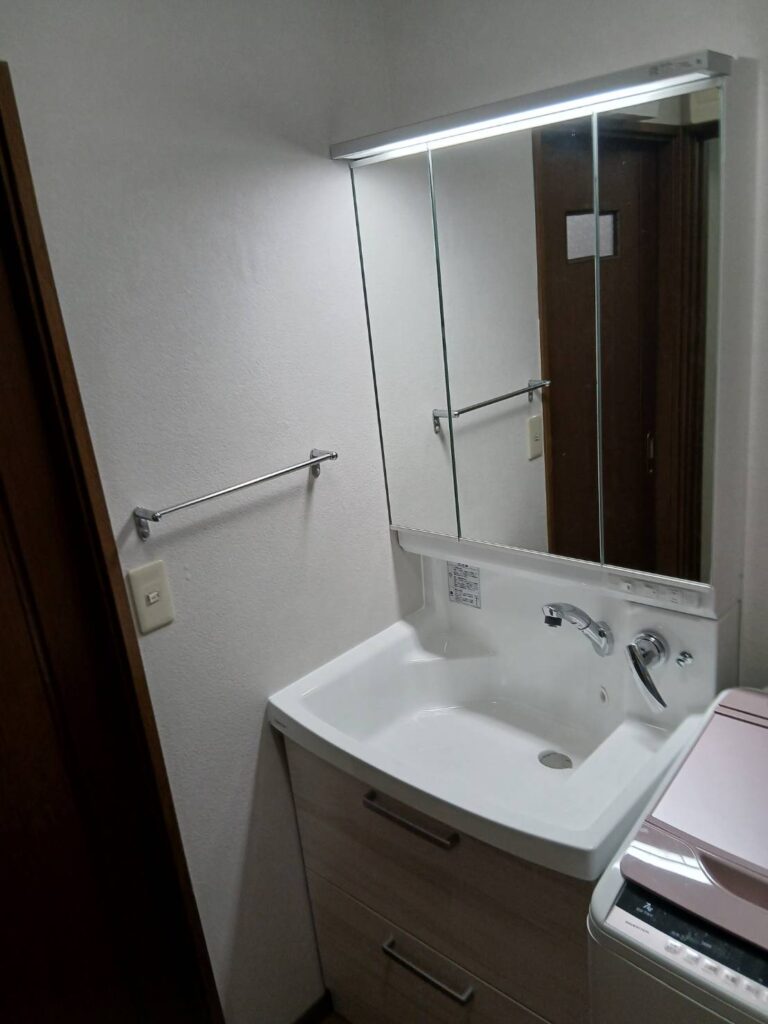 施工前のお写真です。 収納スペースが少なかったので 収納が多めのを希望されました。 展示中のクリナップの洗面化粧台を気に入られてありました。