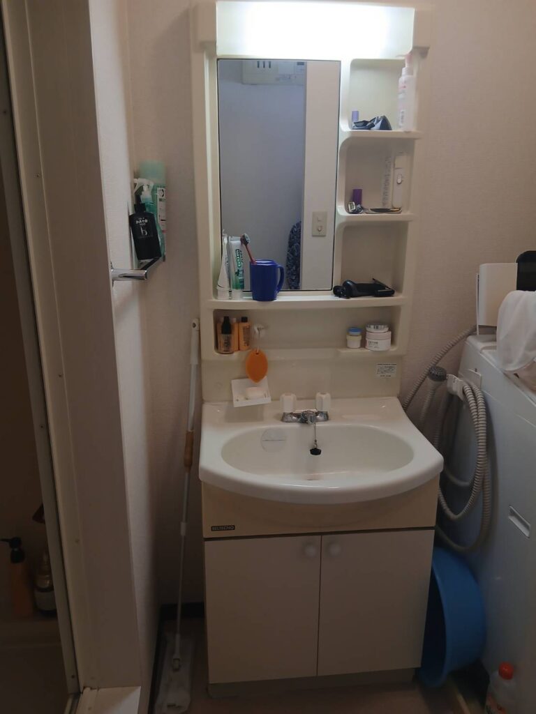 洗面化粧台リフォーム前のお写真です。 水栓の所がサビてきて使いにくくなってきていたとの事でしたので 比較的安価で使い勝手のよいLIXILの洗面化粧台をオススメ致しました。