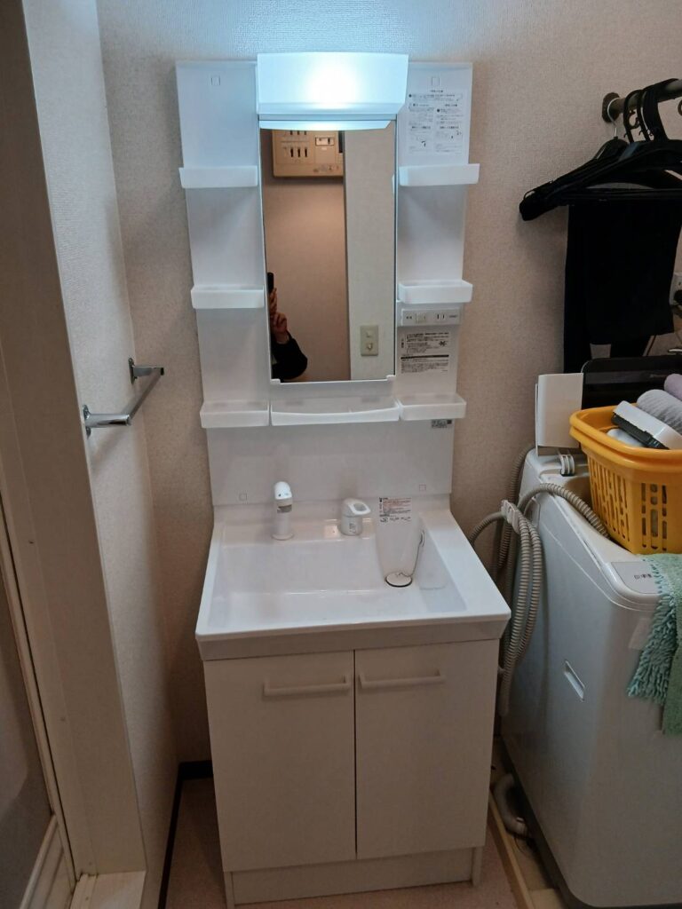 洗面化粧台の水栓の所がサビてきて使いにくく古くなってきたので 交換を希望されました。 コンパクトながらも、スッキリ見えて機能性もよいLIXIL製の化粧台を オススメしました。
