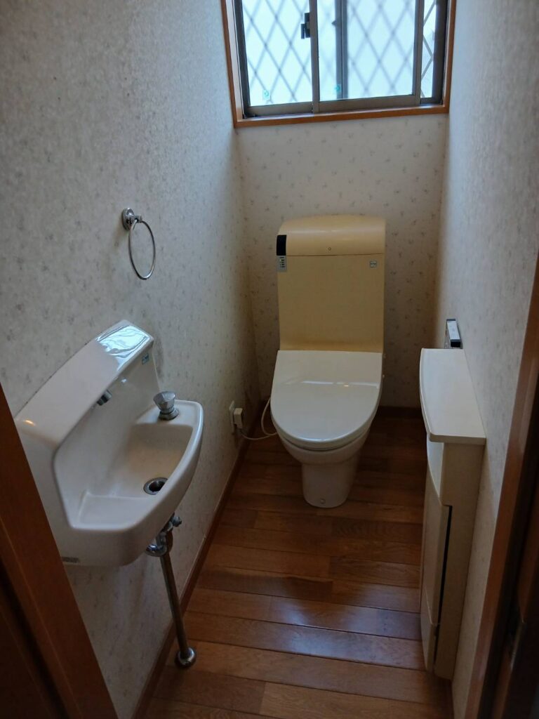 施工前のお写真です。 フチなしトイレを希望されましたので LIXIL製のトイレをオススメしました。 壁紙も交換されたいとのご希望でした。