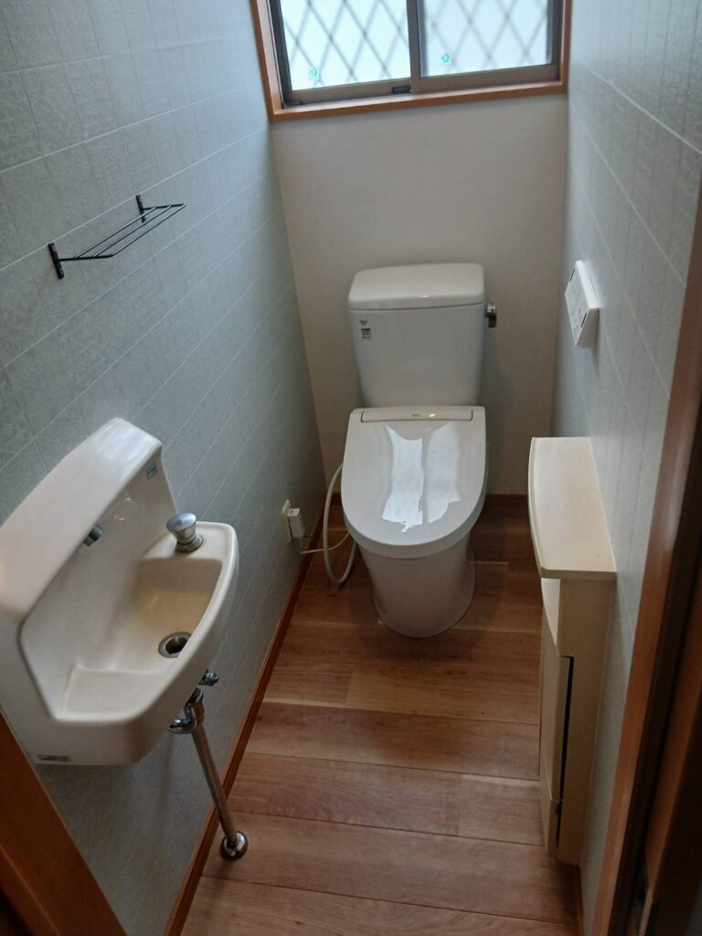 施工後のお写真です。 壁紙も明るくなりトイレも白色になり スッキリ見ます。