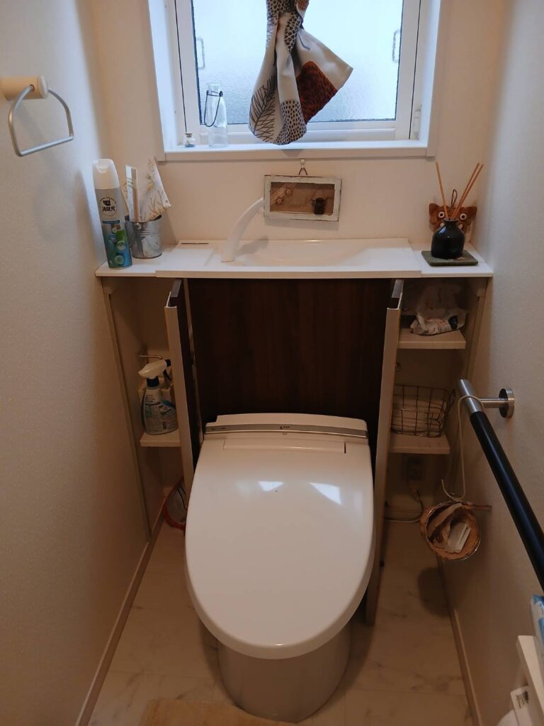 ショールームにご来店され、トイレの後ろの手洗付キャビネットをはずしたいとのご相談でした。 それと同時にトイレの交換を検討されてありました。 こちらからは、キャビネットを外しタンク付きのトイレをご提案させていただきました。